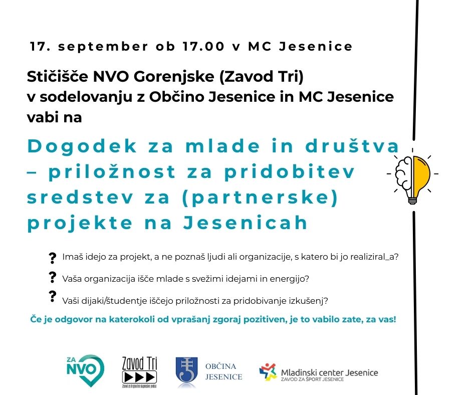 Stičišče nevladnih organizacij Gorenjske skupaj z Občino Jesenice in Mladinskim centrom Jesenice vabi na dogodek za mlade, društva (in druge NVO) in izobraževalne ustanove. Dogodek bo priložnost za grajenje partnerskih sodelovanj. Naša skupna želja je, da bi na srečanju oblikovali vsaj dve konkretni projektni ideji, ki bi se lahko prijavili na razpis stičišča za male projekte (v vrednosti do 2.000 EUR).