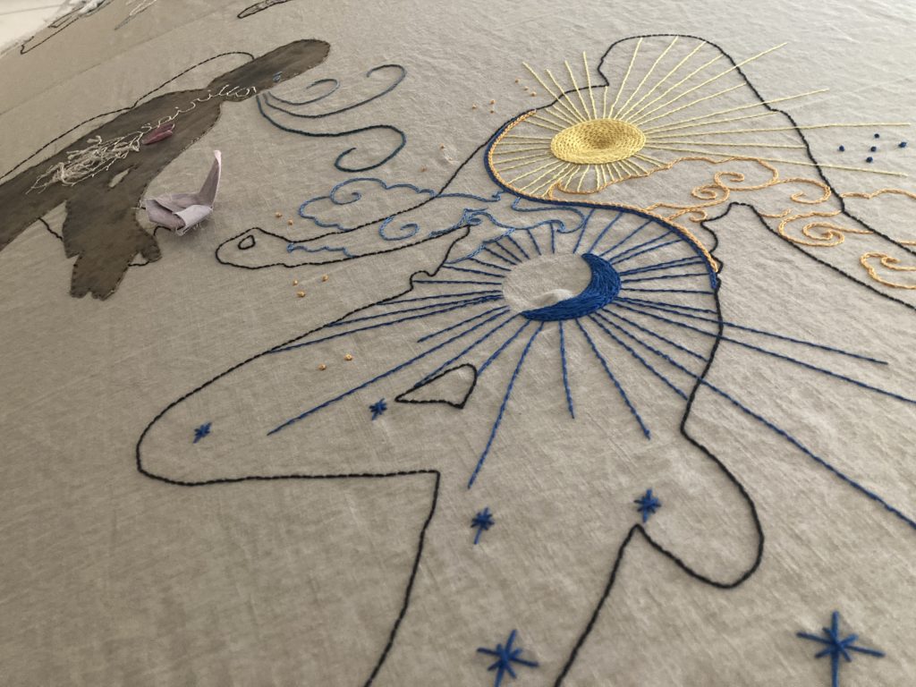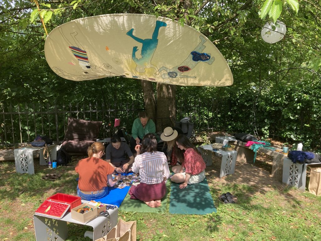 Na uvodnem srečanju so članice krožka postavile okvir za sodelovanje v novem študijskem letu, si razdelile vloge in pripravile urnik. Dogovorile so se, da bo osnovo za skupno instalacijo predstavljalo reciklirano platno, napeto na okrogel okvir starega šotora – simbol kroženja, prilagodljivosti in ponovne uporabe. S fotografiranjem v naravni velikosti so članice ustvarile izhodišče za delo na skupni tekstilni sliki, na katero so razporedile lastne silhuete, jih izrezale, obrobile z vezenjem in jih postopoma začele izpolnjevati z vsebino –takšno, ki izraža njihov notranji svet in osebno izkušnjo zraka kot elementa in kot metafore.